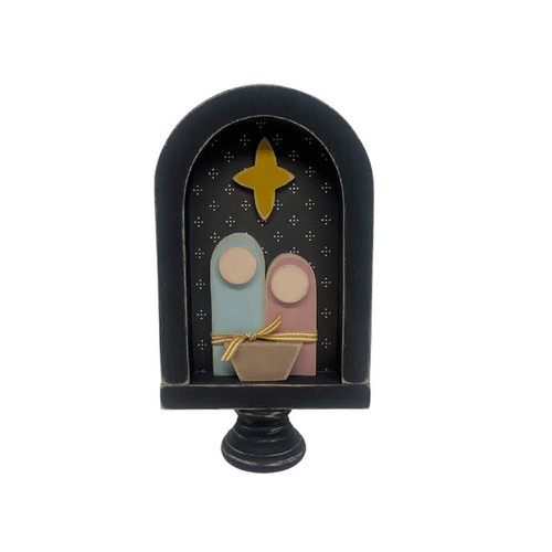 includes arch frame, egg cup, Mary, Joseph, manger and star.