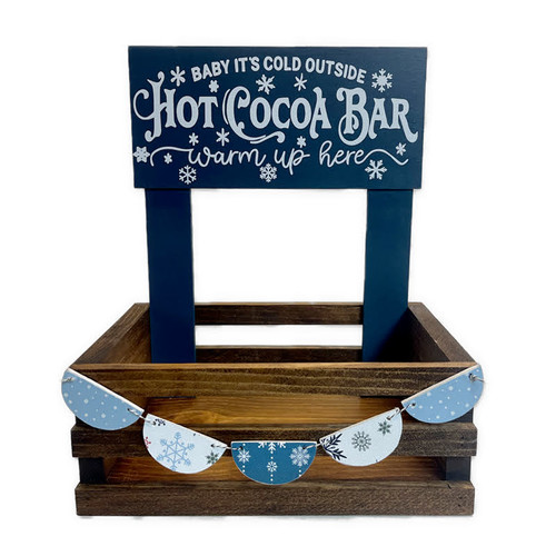 Our hot cocoa crate includes 1 small crate, 1 sign made from 1/8" MDF hot cocoa vinyl in white and 5 tiny banner shapes.
